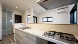 カウンター上部と洗濯機上部には室内物干しを設置。